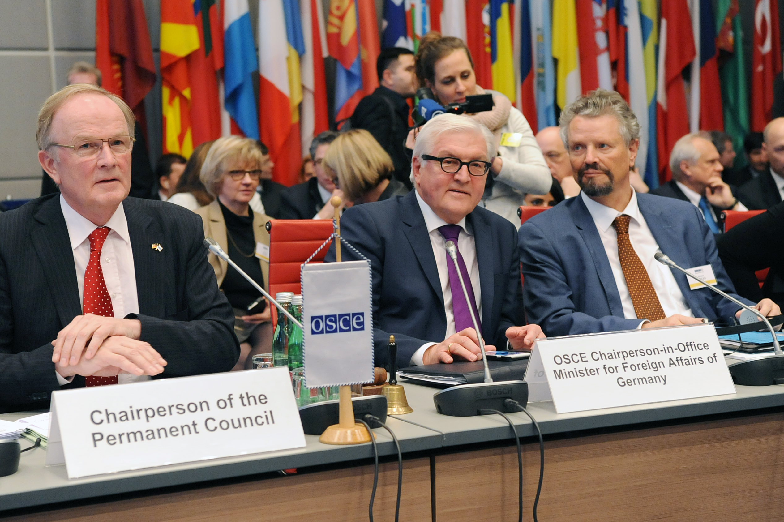 (L-r) 2016 OSCE Chairperson of the Permanent Council Ambassador Eberhard Pohl; OSCE Chairperson-in-Office, German Federal Minister for Foreign Affairs Frank-Walter Steinmeier: and Gernot Erler, Special Representative of the Federal Government of Germany for the OSCE Chairmanship in 2016, during the first Permanent Council meeting, Vienna, 14 January 2016.