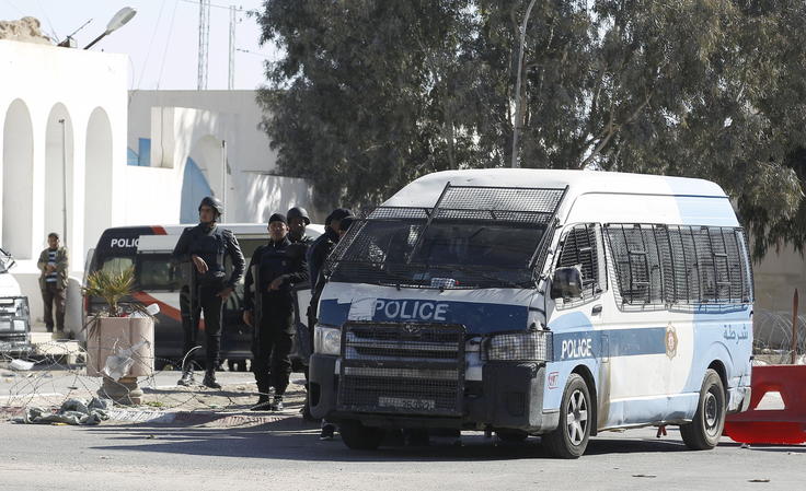 Tunisian police officers stand guard near a police station after Monday's attack by Islamist fighters on an army and police barracks in the town of Ben Guerdan, Tunisia, near the Libyan border, 8 March 2016.