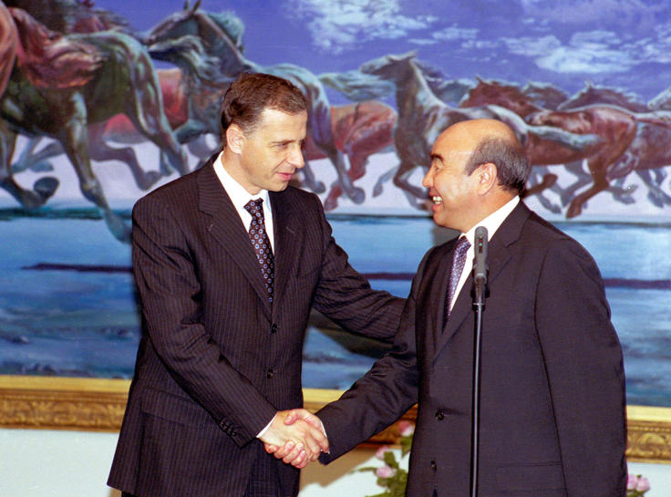 Geoana (left), meets with President Askar Akaev of Kyrgyzstan, 6