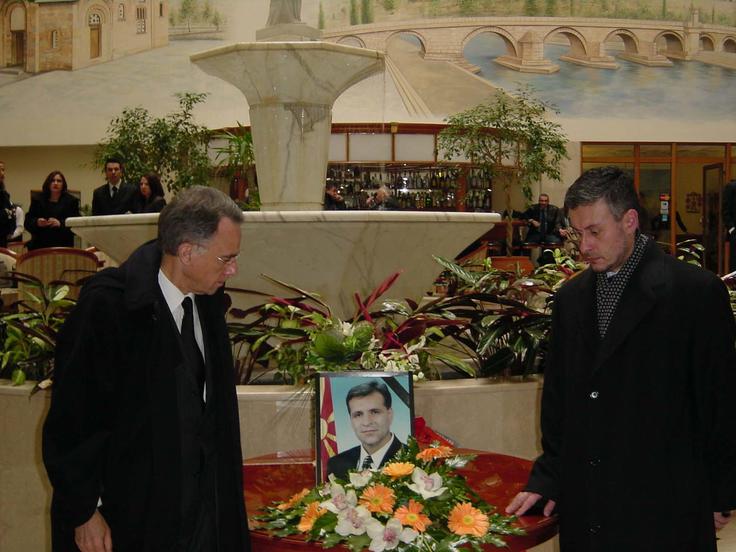 OSCE Chairman-in-Office, Bulgarian Foreign Minister Solomon Passy (right), and Carlos Pais, Head of the OSCE Spillover Monitor Mission to Skopje, pay tribute to the late Macedonian President Boris Trajkovski at a funeral service in Skopje, 5 March 2004.