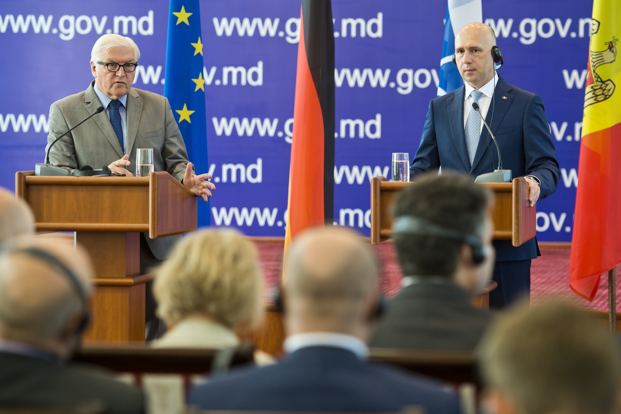 OSCE Chairperson-in-Office, German Foreign Minister Frank-Walter Steinmeier (l) and Prime Minister of the Republic of Moldova Pavel Filip at a joint press conference, Chisinau, 26 July 2016.