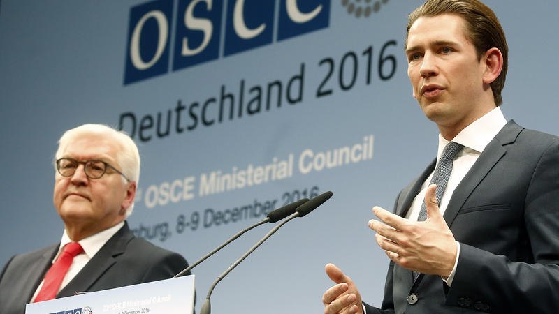 OSCE Chairperson-in-Office and German Foreign Minister Frank-Walter Steinmeier (l) alongside incoming Chairperson, Austrian Foreign Minister Sebastian Kurz, speaking at the conclusion of the OSCE Ministerial Council in Hamburg, 9 December 2016.
