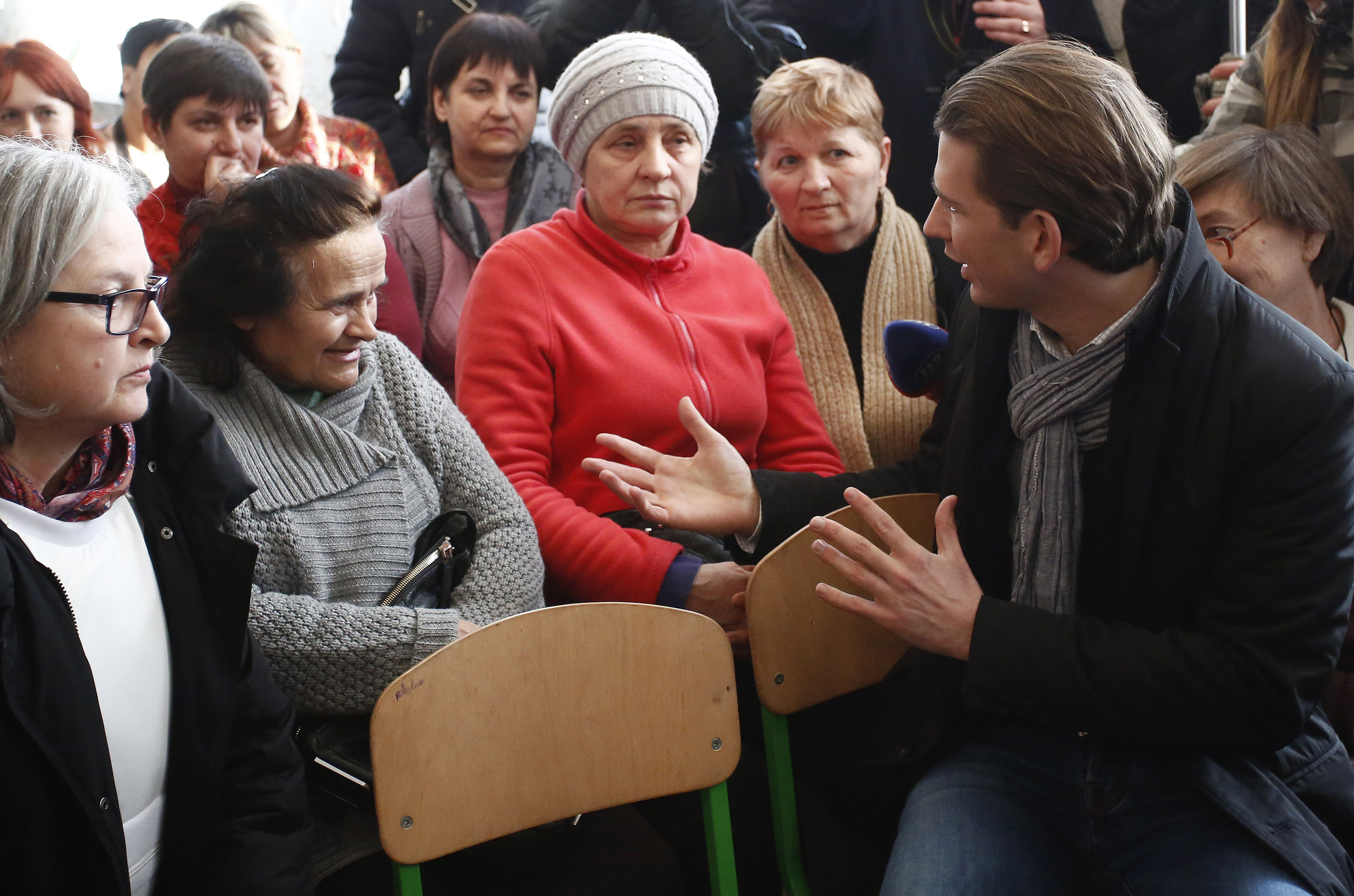 OSCE Chairperson-in-Office and Austrian Foreign Minister Sebastian Kurz (right) speaking to people during his visit to Donetsk region, 4 January 2017.