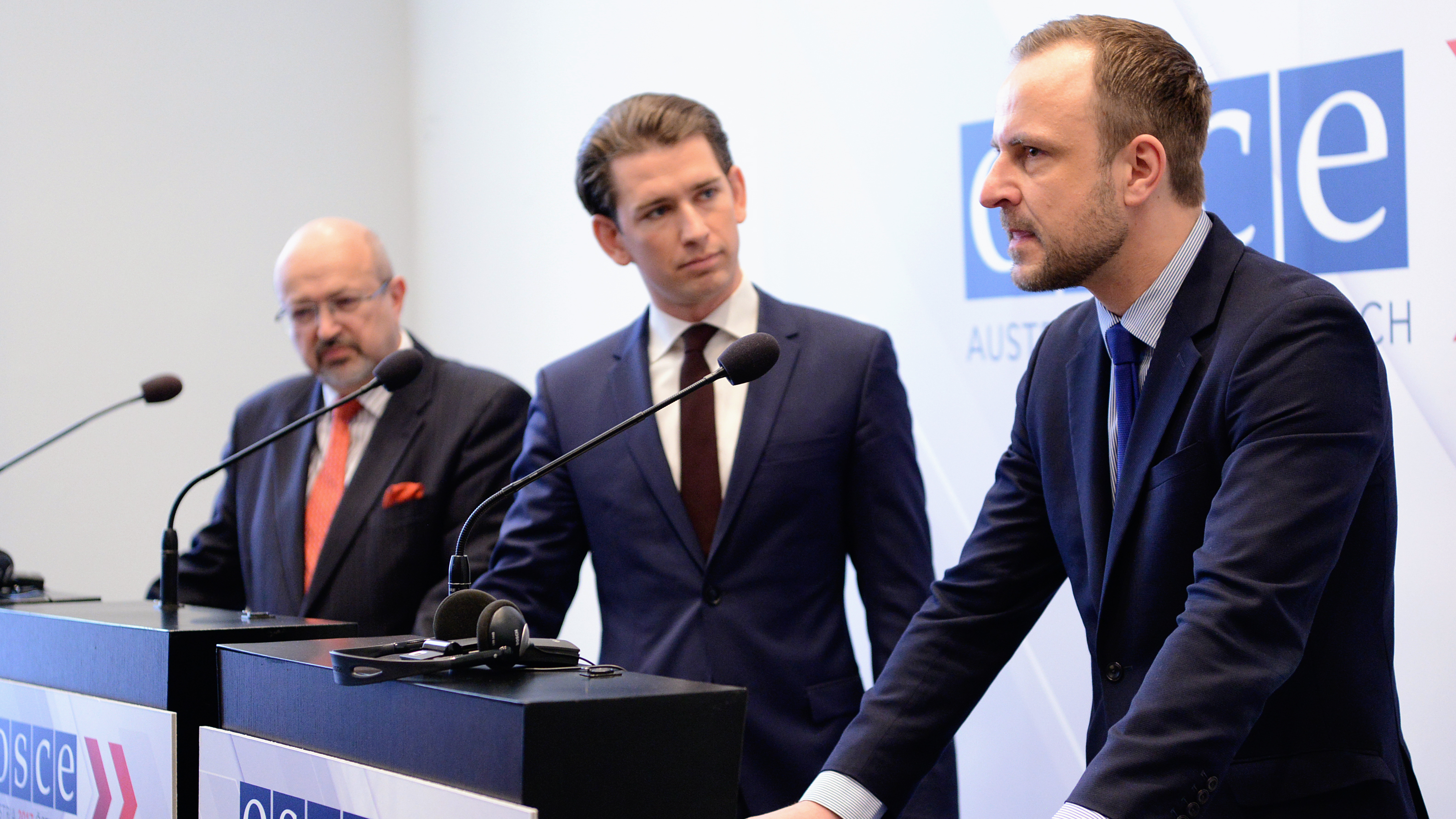 OSCE Special Representative on Countering Radicalization and Violent Extremism, Peter Neumann (r-l), OSCE Chairperson-in-Office, Austrian Foreign Minister, Sebastian Kurz and OSCE Secretary General Lamberto Zannier, speaking at a press conference after the Permanent Council meeting, Vienna, 12 January 2017.