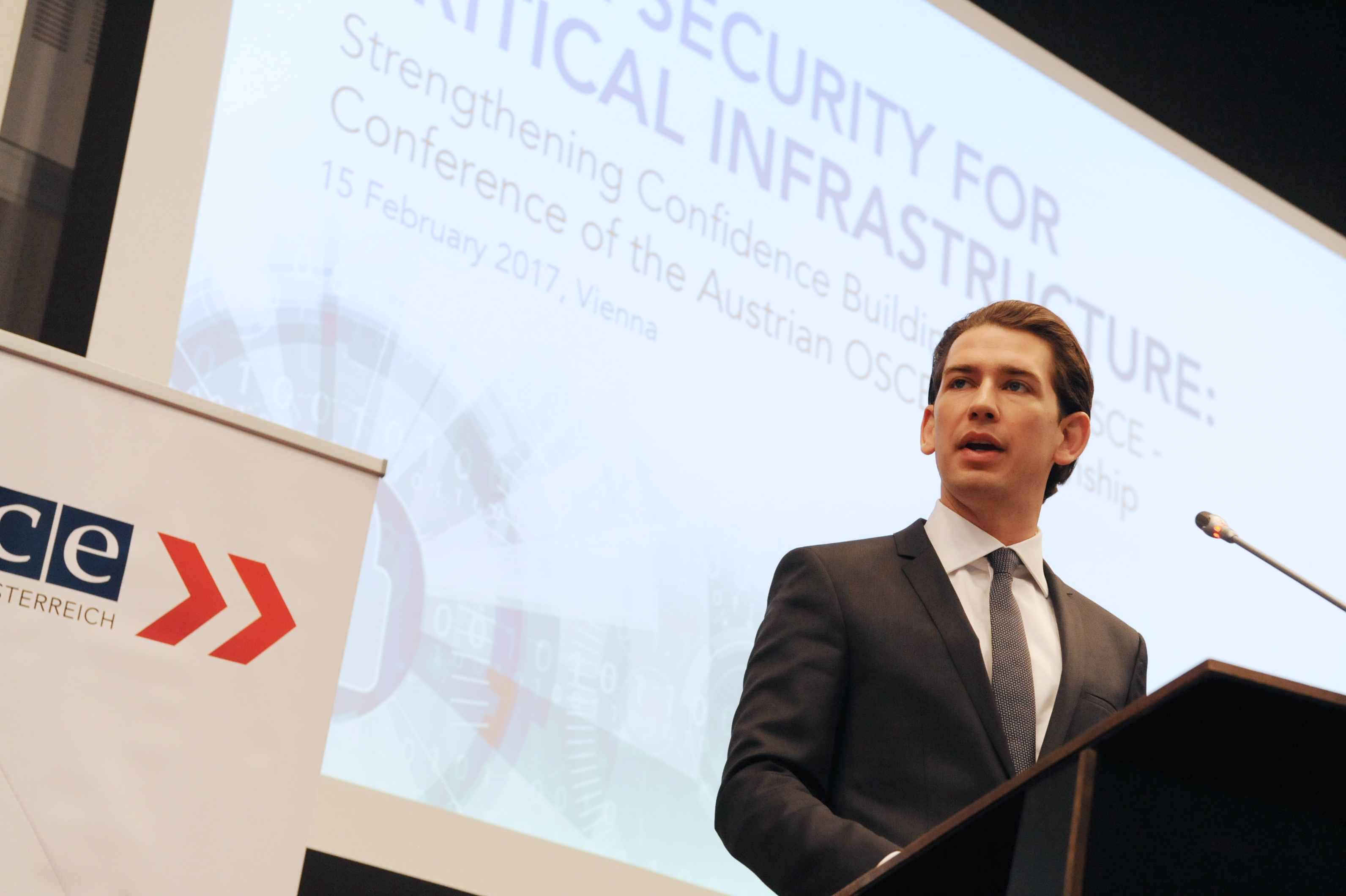 OSCE Chairperson-in-Office and Austrian Federal Minister for Europe, Integration and Foreign Affairs Sebastian Kurz, delivering his opening speech at the Cyber Security for Critical Infrastructure Conference, Vienna, 15 February 2017.