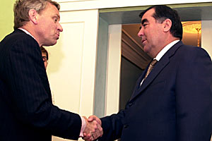 The OSCE Chairman-in-Office, Netherlands Foreign Minister Jaap de Hoop Scheffer, meets Tajikistan's President, Emomali Rahmonov, on 11 July 2003 in Dushanbe.