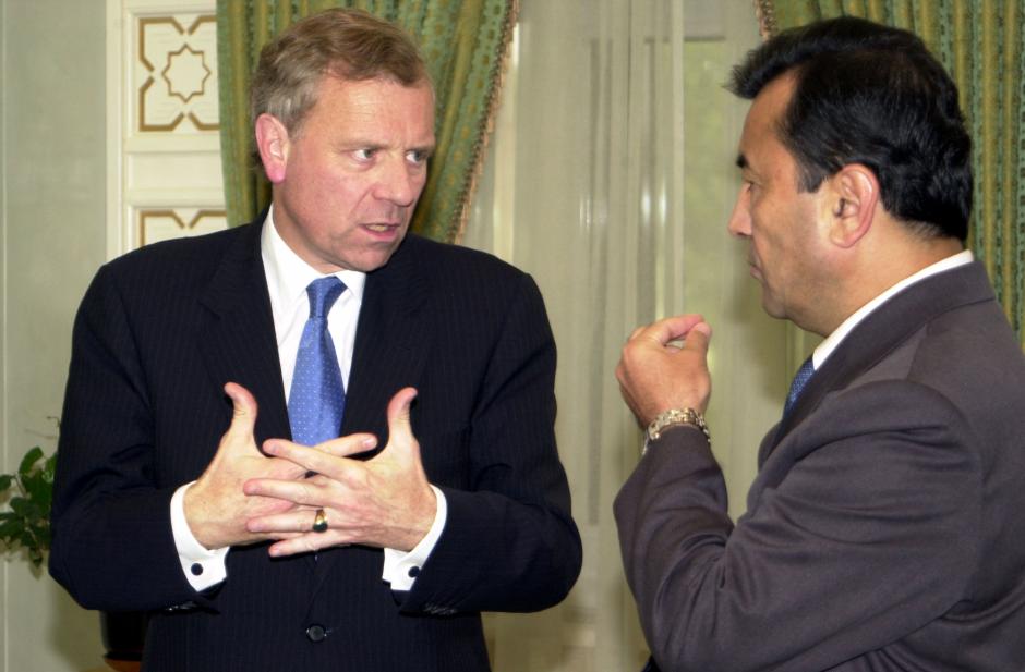 Before meeting the Uzbek President, Minister de Hoop Scheffer continues his discussion with Foreign Minister Safayev, 8 July 2003.