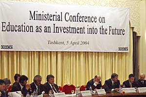 OSCE Chairman-in-Office Solomon Passy (2nd right) speaks at an international conference on education in Tashkent, 5 April, 2004.