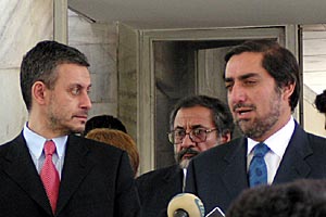 OSCE Chairman-in-Office Solomon Passy (left) and Afghanistan Foreign Minister Abdullah Abdullah at a news conference in Kabul, 10 April 2004.