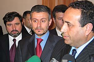 OSCE Chairman-in-Office Solomon Passy (centre) and Azerbaijan's Foreign Minister Vilayat Guliyev (right) talk to journalists in Baku, 16 March 2004.