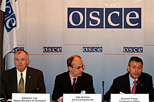 Admiral James Loy (left), US Deputy Secretary for Homeland Security, EU Counter-Terrorism Co-ordinator Gijs de Vries, and the OSCE Chairman Solomon Passy (right), at the Annual Security Review Conference, 23 June 2004.
