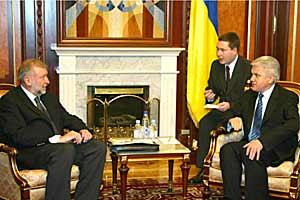 OSCE Chairman-in-Office, Slovenian Foreign Minister Dimitrij Rupel (left), meeting Ukrainian Parliament Speaker Volodymyr Lytvyn in Kyiv, 5 January 2005.