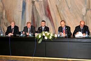 Speaking to the media at the OSCE Ministerial Council were (from left) Spokesperson Richard Murphy, Slovenian Foreign Minister Dimitrij Rupel, OSCE Chairman-in-Office Solomon Passy, Amb Daan Everts (Netherlands), Amb Ivan Naydenov (Bulgaria). 7 Dec 2004.