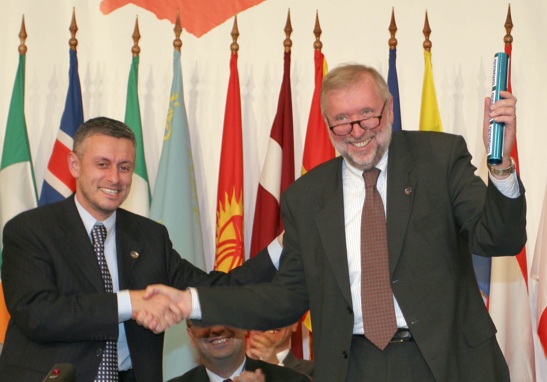 Outgoing Chairman-in-Office Solomon Passy of Bulgaria (left), symbolically passes the baton of the OSCE Chairmanship to Slovenian Foreign Minister Dimitrij Rupel. Sofia, 7 Dec 2004