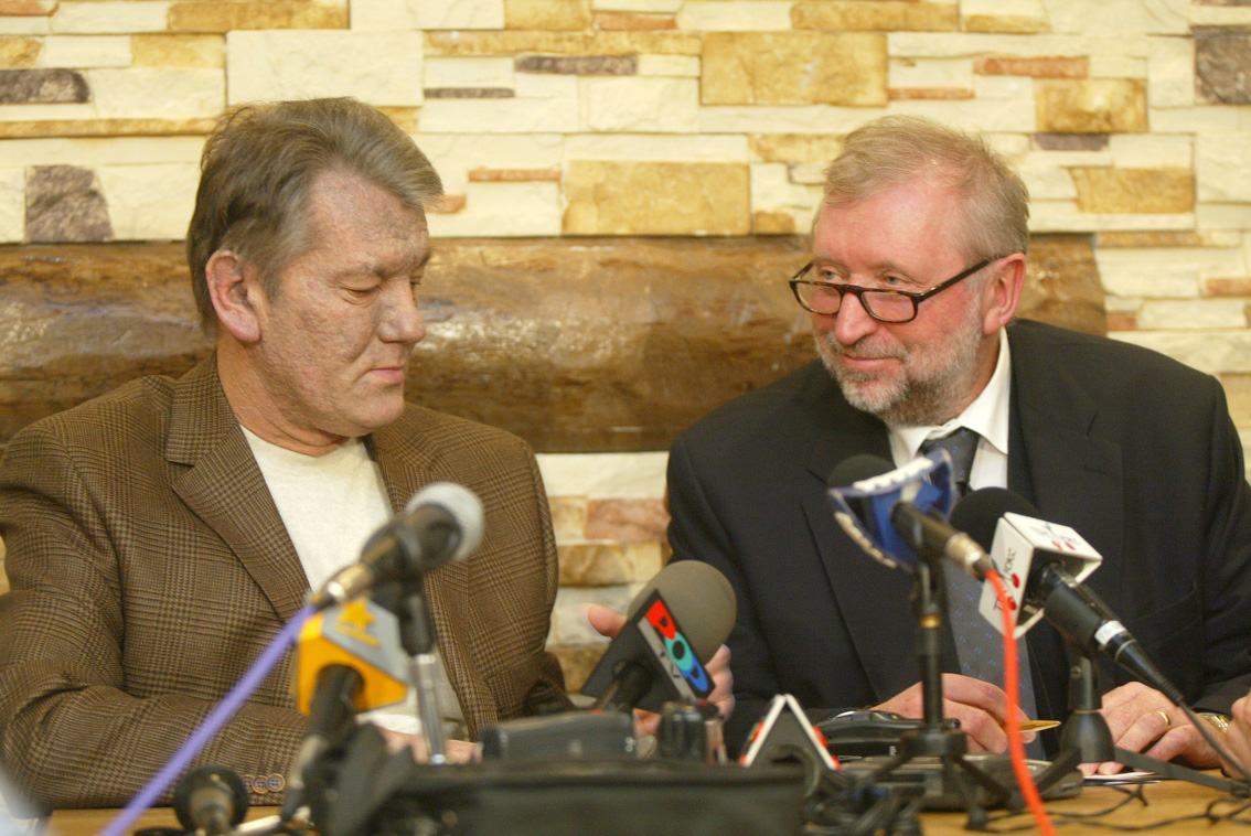 OSCE Chairman-in-Office Dimitrij Rupel (right) and Ukranian President-elect Viktor Yushchenko at a press conference in the Carpathian mountains, western Ukraine, 5 January 2005