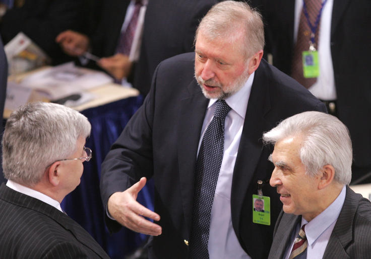 OSCE Chairman-in-Office Dimitrij Rupel (centre) talking with German Foreign Minister Joschka Fischer and Polish Foreign Minister Adam Rotfeld at the Munich Conference on Security Policy, 12 and 13 February 2005