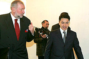 OSCE Chairman-in-Office Dimitrij Rupel (left) meets with Deputy Foreign Minister of Kazakhstan, Ashkar Shakirov, in Astana, 15 February 2005.