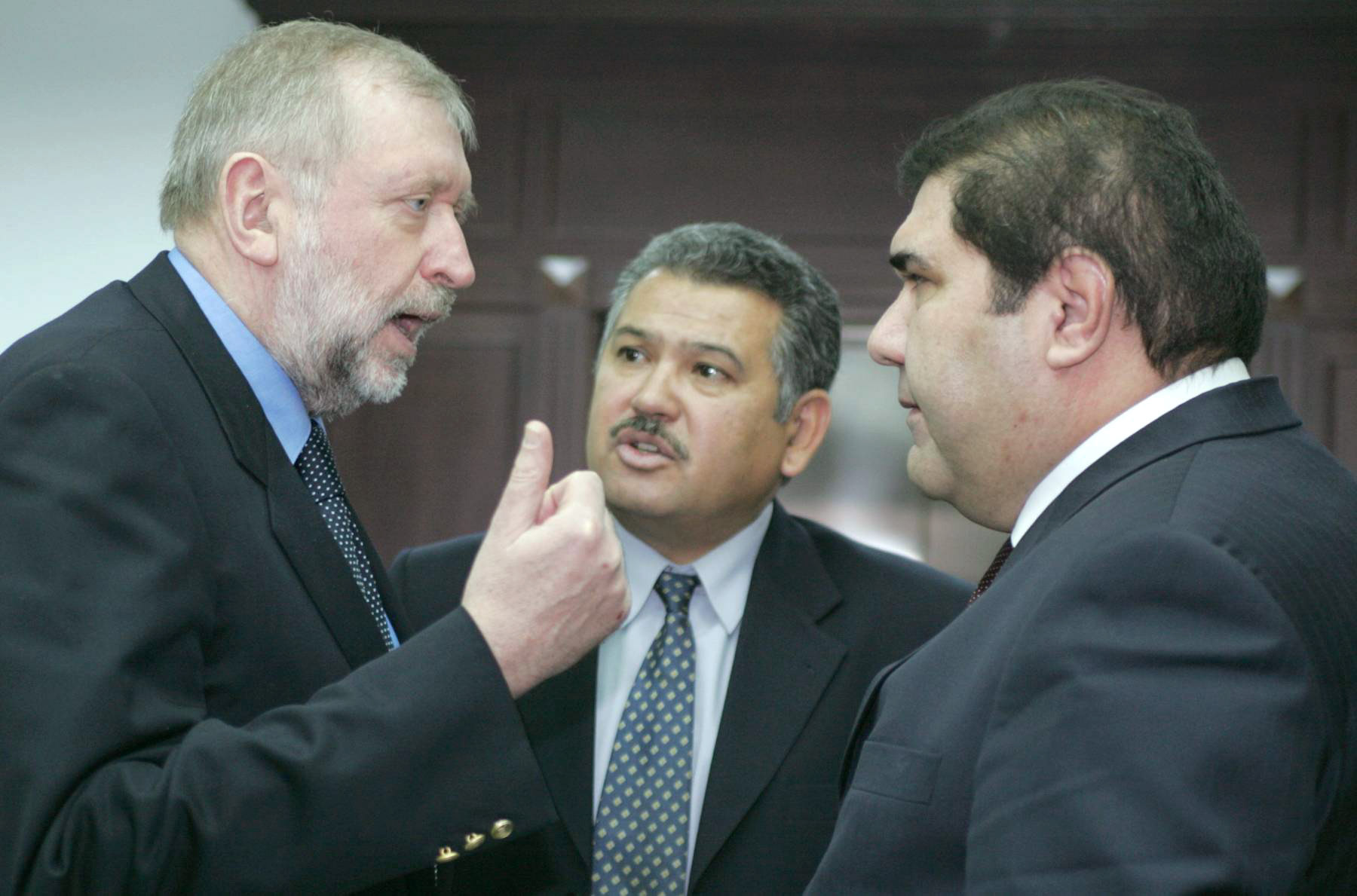 OSCE Chairman-in-Office Dimitrij Rupel (left) meets Uzbek Foreign Minister Elyer Ganiyev in Tashkent, 16 February 2005.