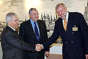 Polish Foreign Minister Adam Daniel Rotfeld (left), Council of Europe Secretary General Terry Davis (centre) and OSCE Chairman-in-Office Dimitrij Rupel at the 14th high-level meeting of the two organizations, Strasbourg, 23 February 2005.