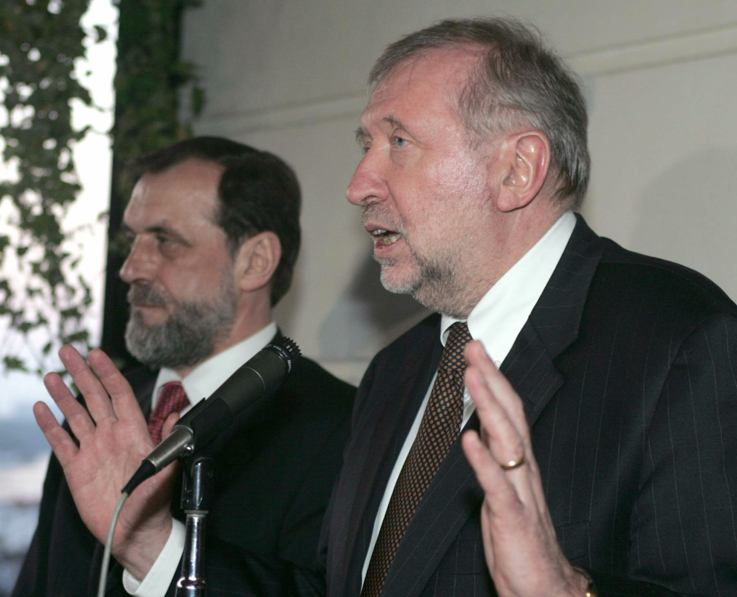 OSCE Chairman-in-Office Dimitrij Rupel (right) meets Foreign Minister of Serbia and Montenegro Vuk Draskovic in Belgrade, 4 April 2005.