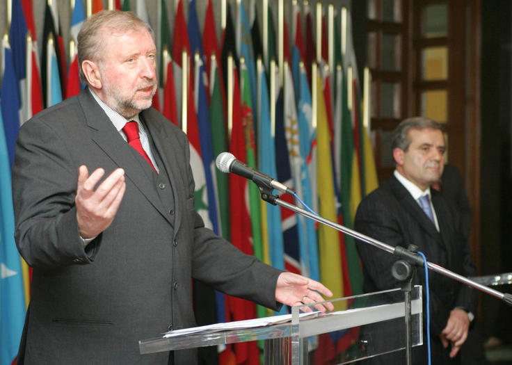 The OSCE Chairman-in-Office Dimitrij Rupel and Albanian Foreign Minister Kastriot Islami speak to press in Tirana, 11 April 2005.