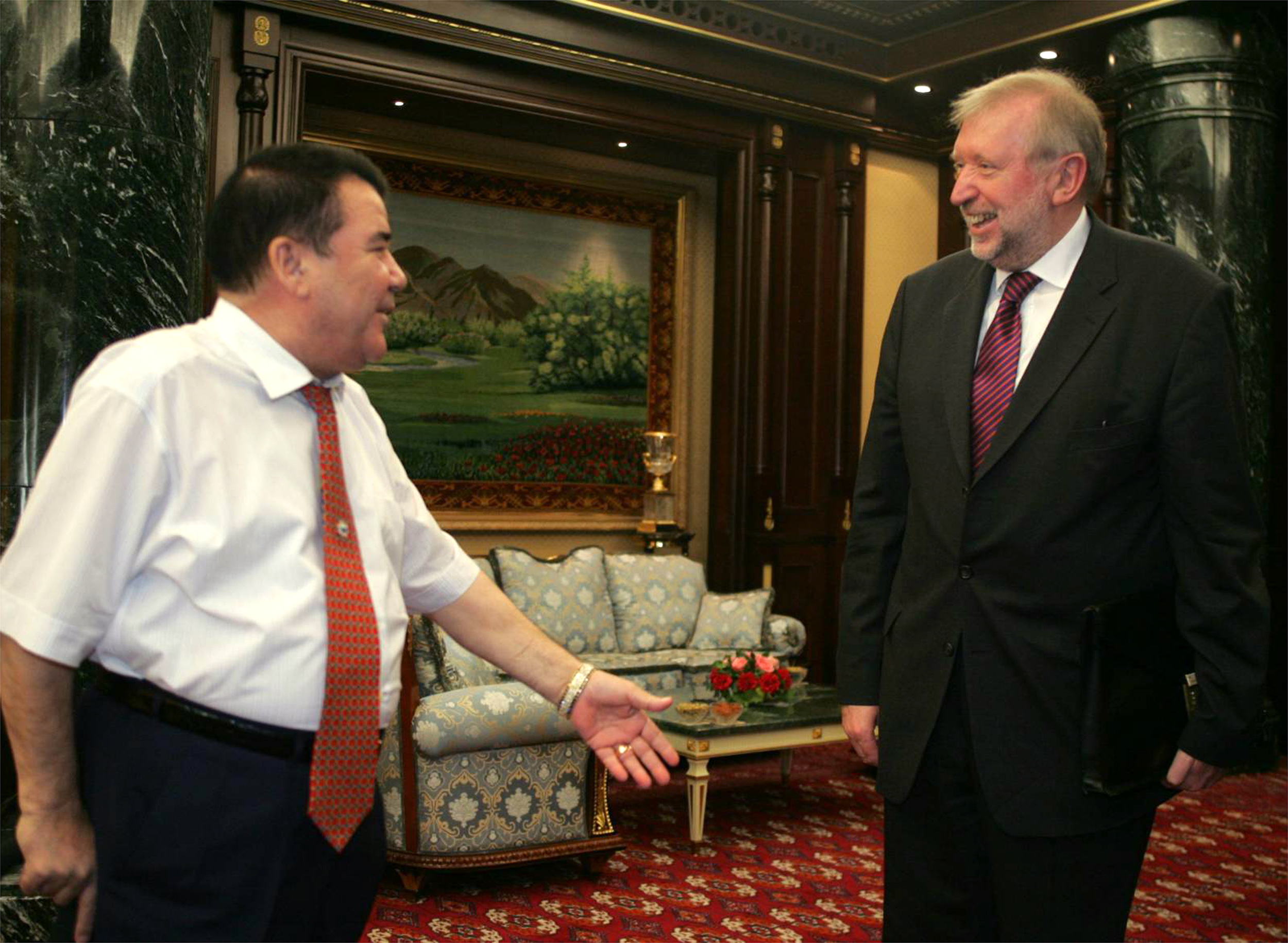 OSCE Chairman-in-Office Dimitrij Rupel (right) meets Turkmen President Saparmurat Niyazov in Ashgabat, 20 April 2005.
