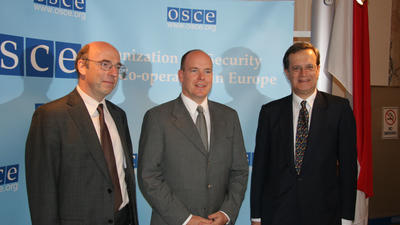 During his visit, Prince Albert met the Secretary General of the OSCE, Marc Perrin de Brichambaut, and the head of Belgium's delegation to the Organization, Ambassador Bertrand De Crombrugghe. Belgium holds the OSCE Chairmanship this year.