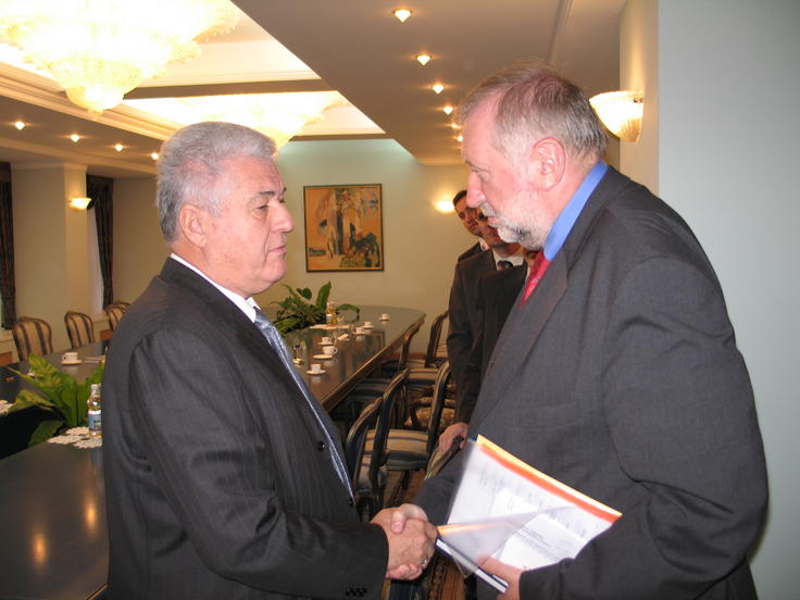 During a visit to Moldova, OSCE Chairman-in-Office Dimitrij Rupel (right) meets President Vladimir Voronin, Chisinau, 18 October 2005.
