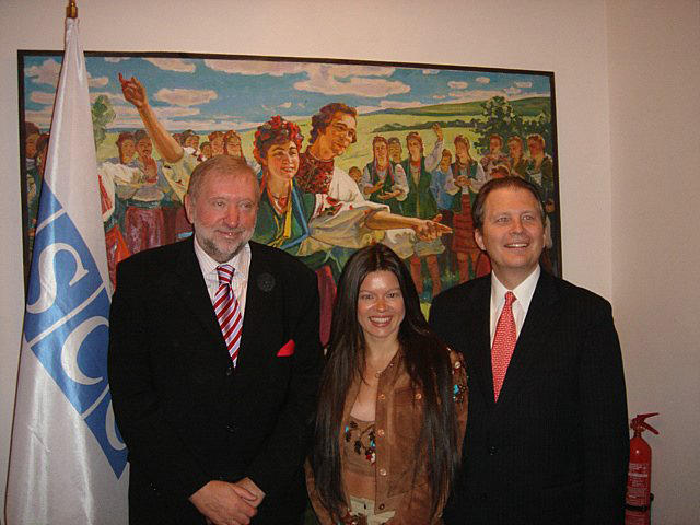 OSCE Chairman-in Office Dimitrij Rupel (left) with OSCE Project Co-ordinator in Ukraine James Schumaker (right) and Ukrainian singer Ruslana in Kyiv, 19 October 2005.