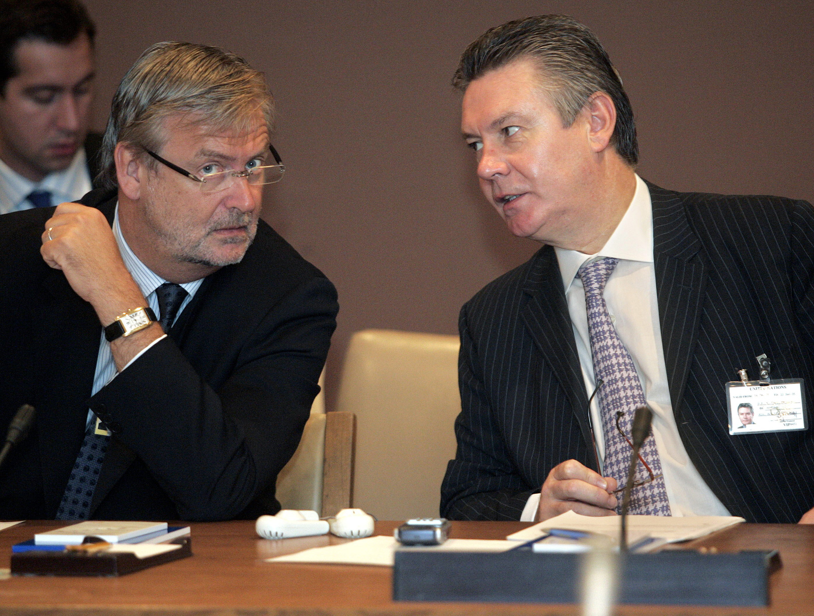 OSCE's Chairman-in-Office in 2006, Belgian Foreign Minister Karel De Gucht (right), consults with Belgian Senator Pierre Chevalier (left), Special Envoy of the Belgian OSCE Chairmanship.