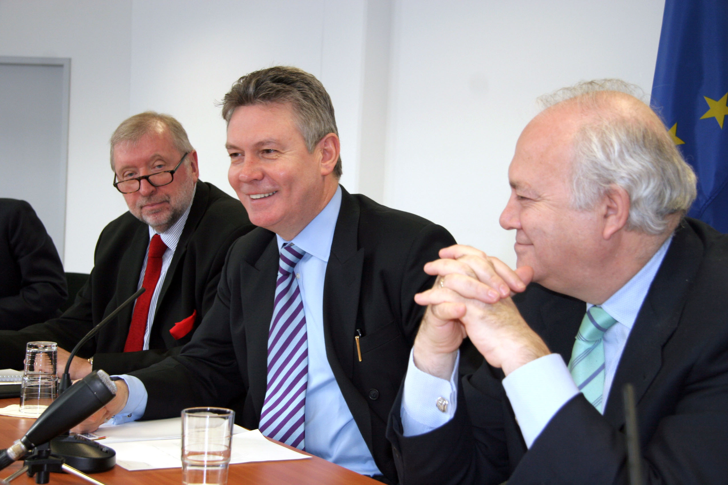 OSCE Chairman-in-Office, Belgian Foreign Minister Karel De Gucht (centre), attends the Troika meeting in Vienna on 13 January 2006, with his counterparts from Slovenia, Dimitrij Rupel (left), and Spain, Miguel Angel Moratinos.