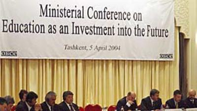 (OSCE/Keith Jinks)OSCE Chairman-in-Office Solomon Passy (2nd right) speaks at an international conference on education in Tashkent, 5 April, 2004. (OSCE/Keith Jinks) Photo details