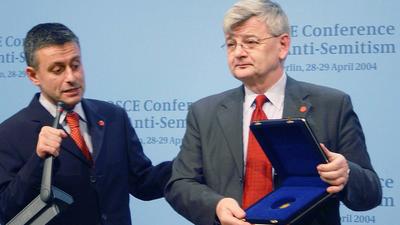 BERLIN, 29 April 2004 - OSCE Chairman-in-Office Solomon Passy marked the end of an OSCE Conference on Anti-Semitism on Thursday by presenting the yellow star his grandfather had worn as a Jew in Bulgaria during World War Two to German Foreign Minister Joschka Fischer.