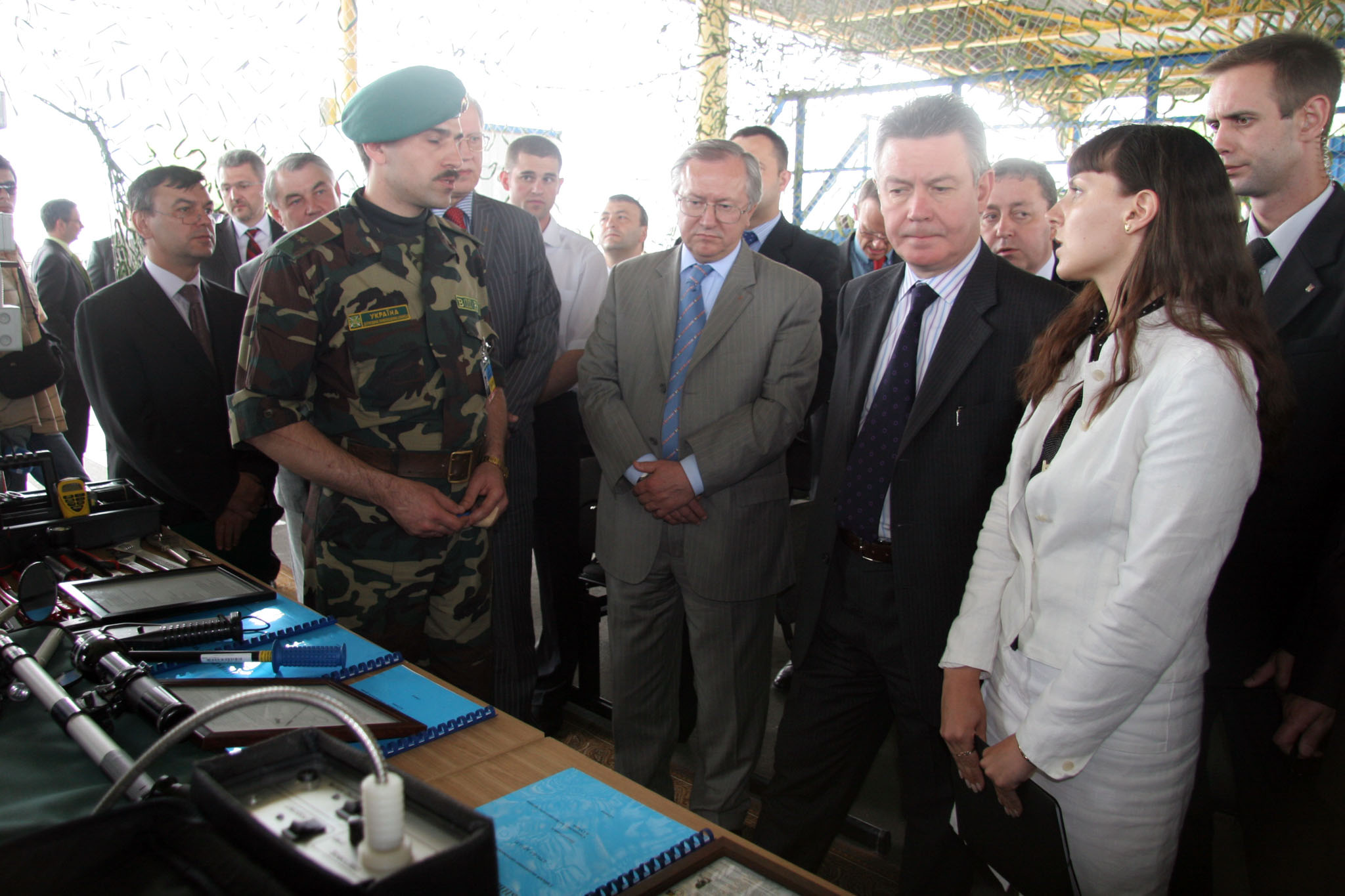 OSCE Chairman-in-Office Karel De Gucht (second right) and Ukrainian Foreign Minister Boris Tarasyuk (third right) visit an EU Border Assessment Mission on the frontier with Moldova, 1 June 2006.