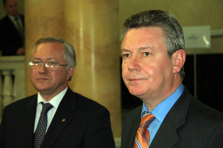 OSCE Chairman-in-Office Karel De Gucht (right) with Ukrainian Foreign Minister Boris Tarasyuk at a press conference in Kiev, 2 June 2006.