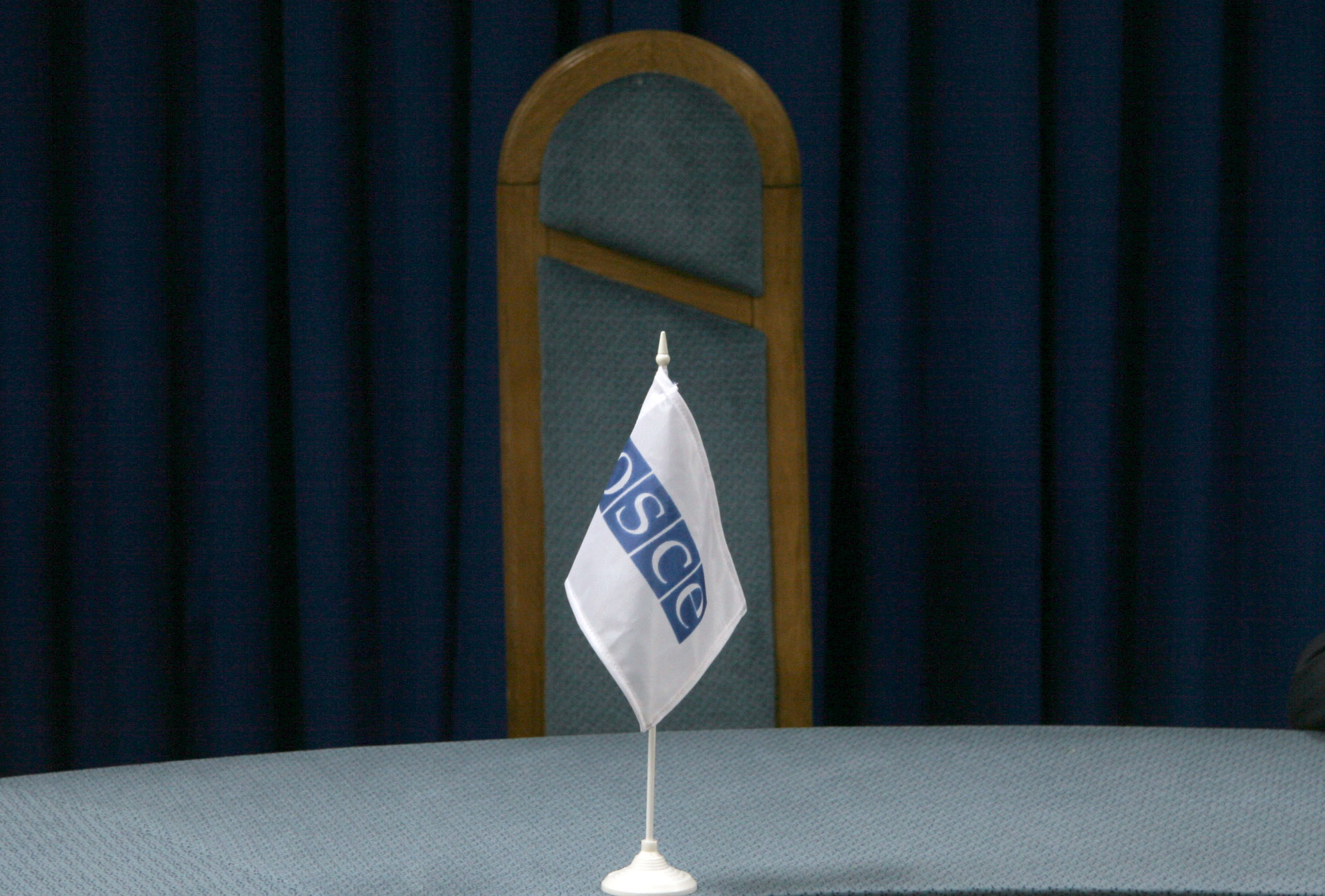 An OSCE flag at a negotiating table. Photo taken before talks in Chisinau, 31 May 2006, during a Chairman-in-Office visit.