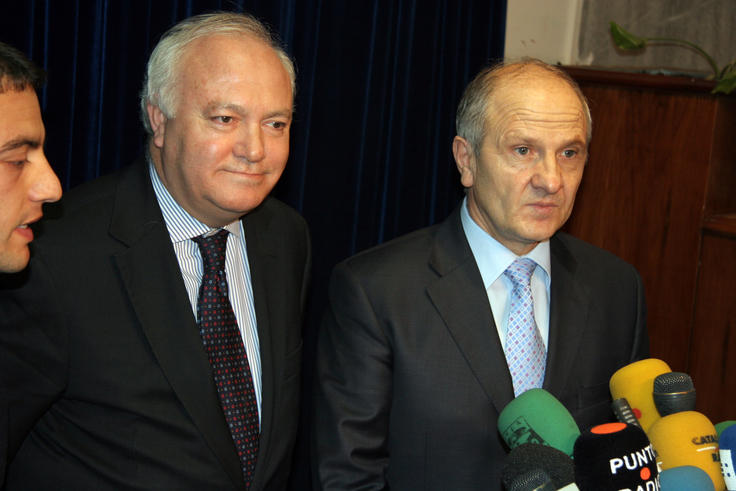 OSCE Chairman Miguel Angel Moratinos (Left) with President Fatmir Sejdiu, after talks in Pristina, Kosovo, 27 February 2007.