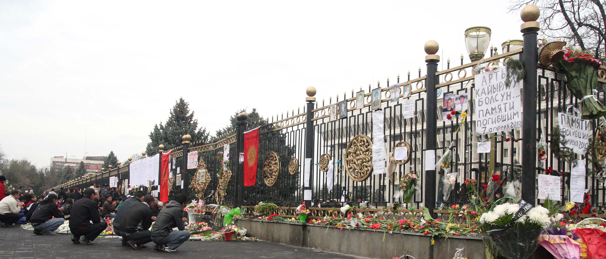 People mourn those who lost their lives in front of the White House in Bishkek, 8 April 2010