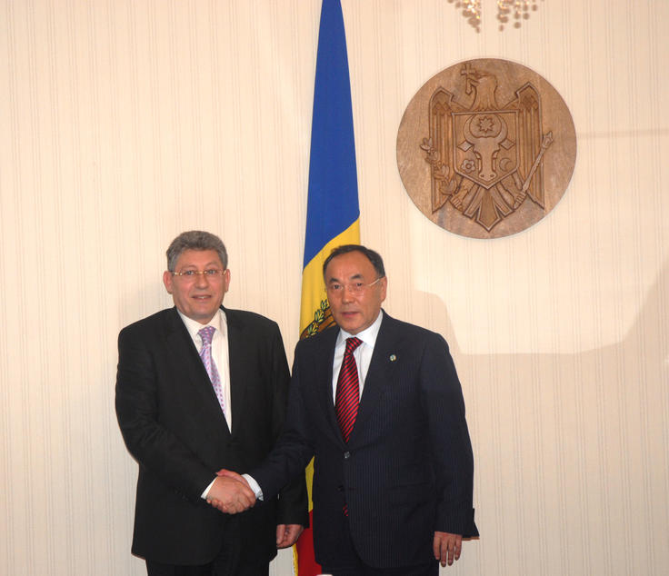 The OSCE Chairperson-in-Office, Kazakhstan's Secretary of State and Foreign Minister, Kanat Saudabayev with Moldova's Acting President and Parliamentary Speaker Mihai Ghimpu, Chisinau, 1 April 2010.