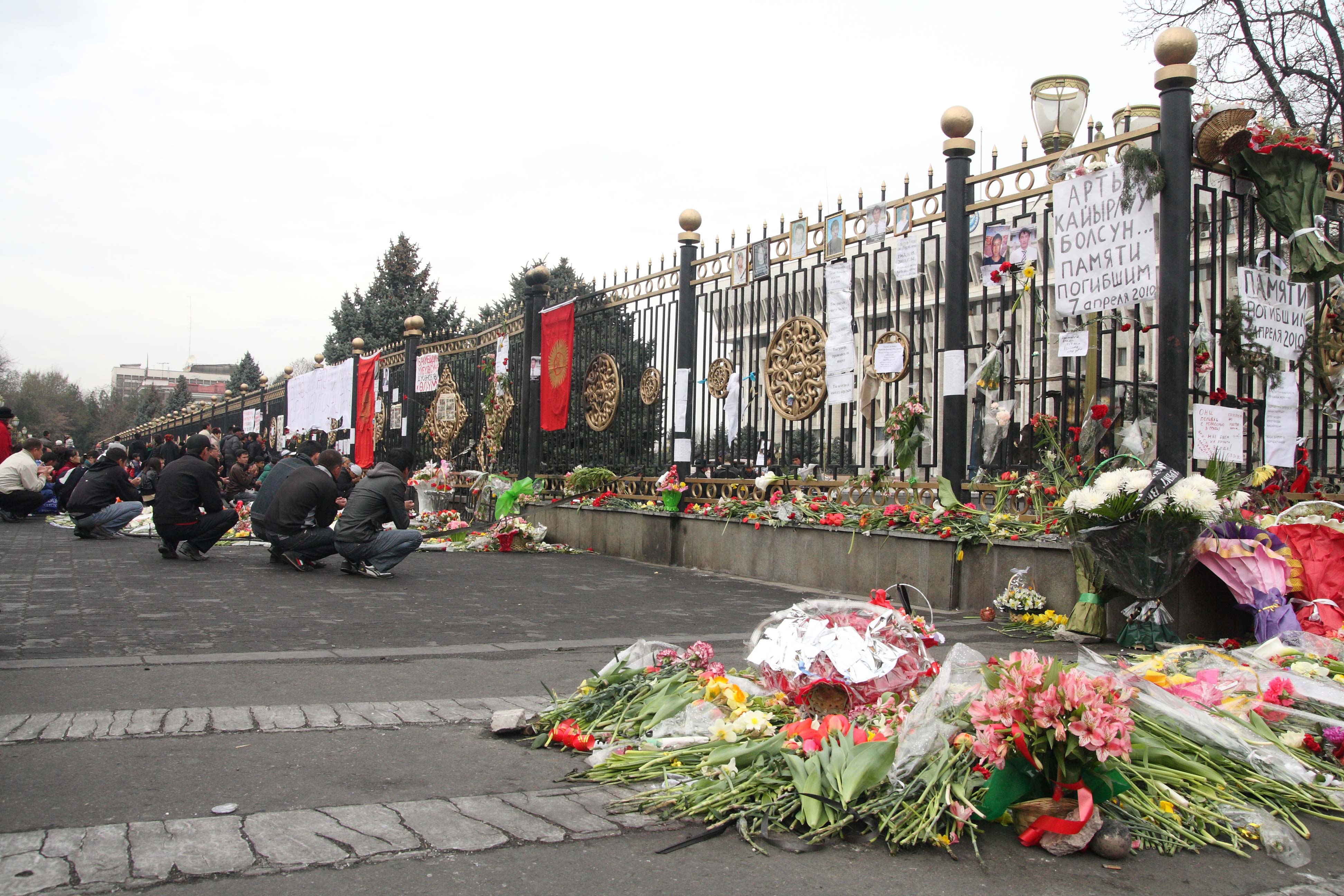 People pray beside flowers laid outside the gates of the White House in Bishkek in tribute to those killed in the violence, 11 April 2010.
