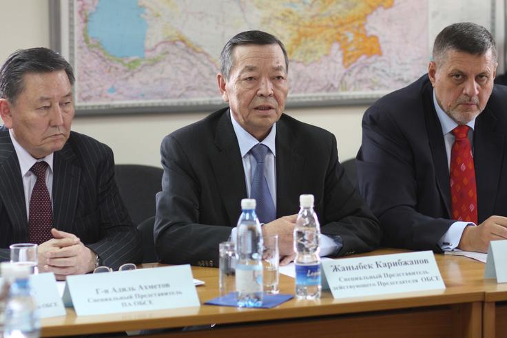 Special Envoy of the OSCE Chairperson-in-Office, Zhanybek Karibzhanov (c) at a meeting in Bishkek, 10 April 2010. Flanking him are the UN Secretary General's Special Envoy, Jan Kubis (r) and OSCE Parliamentary Assembly Special Envoy, Adil Akhmetov.