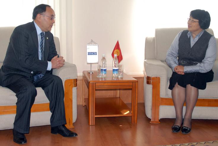 The OSCE Chairperson-in-Office, Kazakhstan's Secretary of State and Foreign Minister, Kanat Saudabayev, meets with the head of the interim government of Kyrgyzstan Roza Otunbayeva in Bishkek, 20 April 2010.