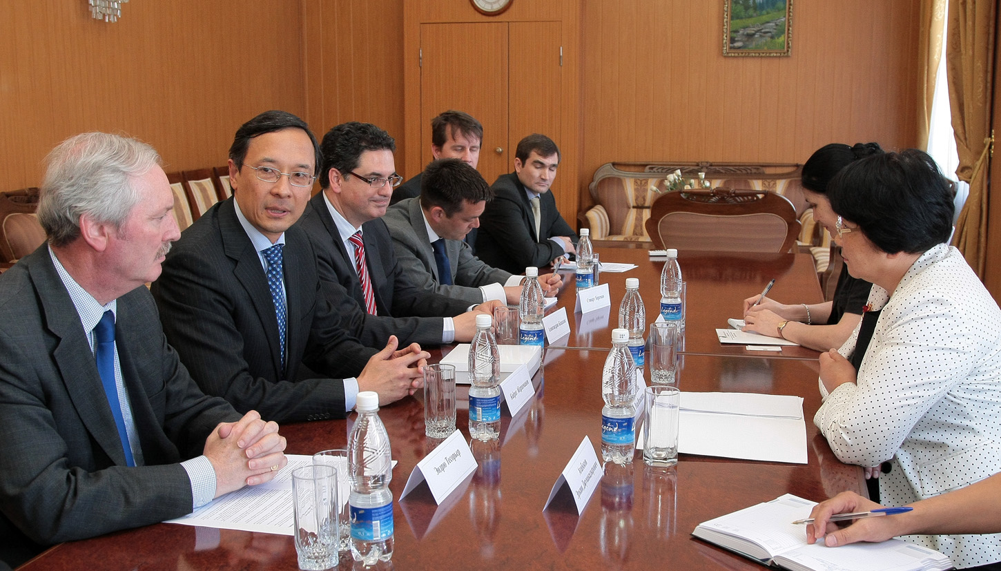 Kazakhstan's Permament Representative to the OSCE, Amb. Kairat Abdrakhmanov (2nd left), meets the President of Kyrgyzstan's provisional government in Bishkek, Roza Otunbayeva, 28 June 2010. On the left: OSCE Centre in Bishkek Head, Amb. Andrew Tesoriere.