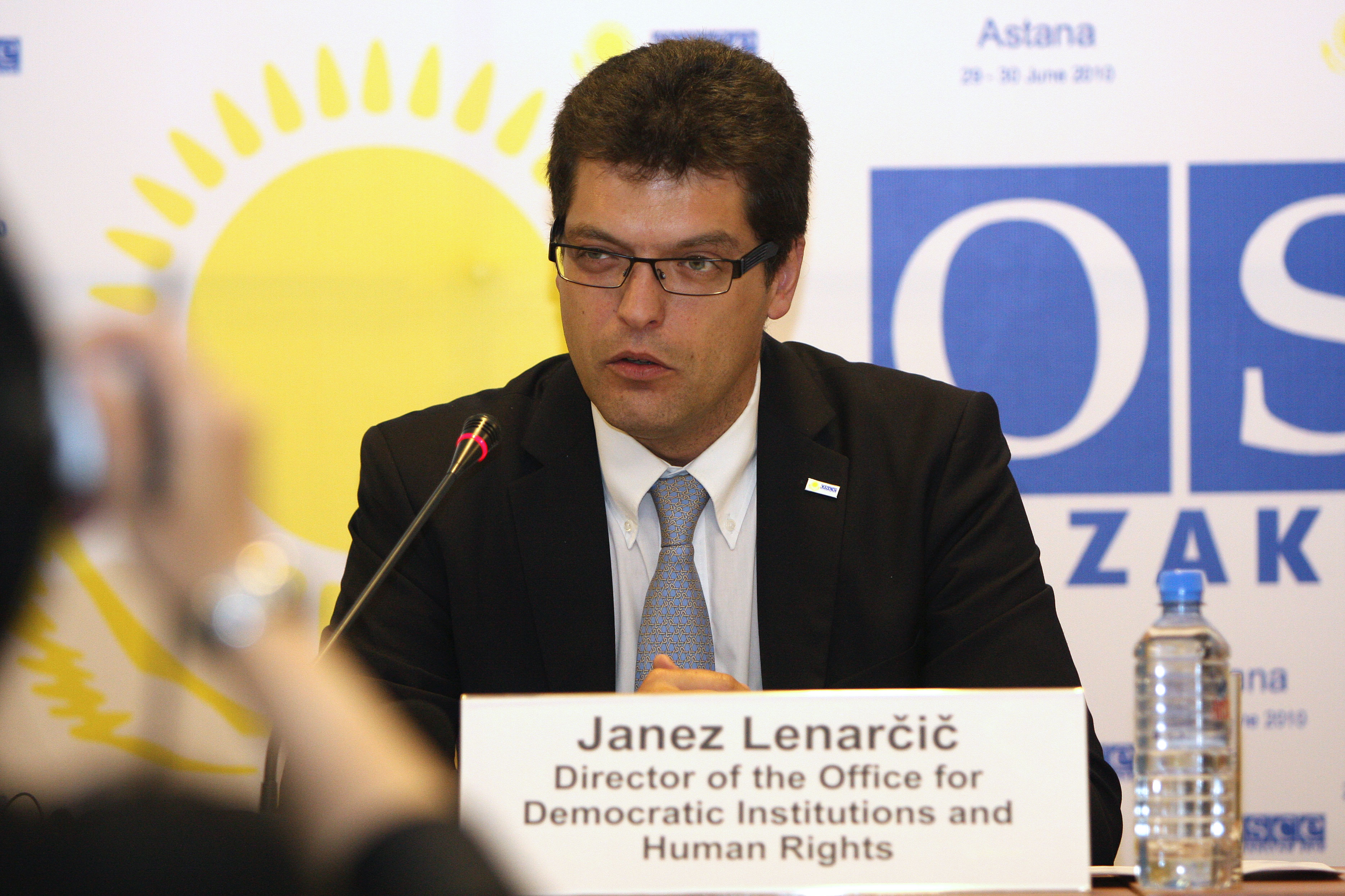 ODIHR Director Ambassador Janez Lenarcic during a press conference at the High-Level Conference on Tolerance and Non-Discrimination, Astana, 30 June 2010.