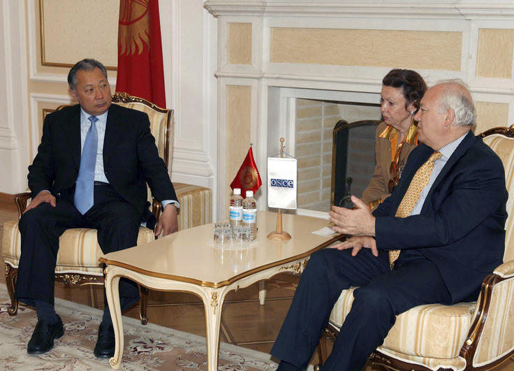 Kyrgyz President Kurmanbek Bakiev (left) during talks with OSCE Chairman Miguel Angel Moratinos in Bishkek, 13 April 2007.