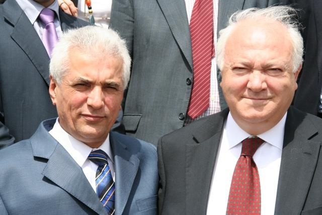 OSCE Chairman-in-Office and Spanish Foreign Minister Miguel Angel Moratinos (right) with Tajikistan's Foreign Minister Hamrokhon Zaripov in Dushanbe, 14 April 2007.