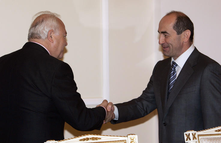 The OSCE Chairman-in-Office, Spanish Foreign Minister Miguel Angel Moratinos (left), meets Armenian President Robert Kocharian at the Armenian presidential palace on 5 June 2007. Minister Moratinos is on a tour of the South Caucasus.