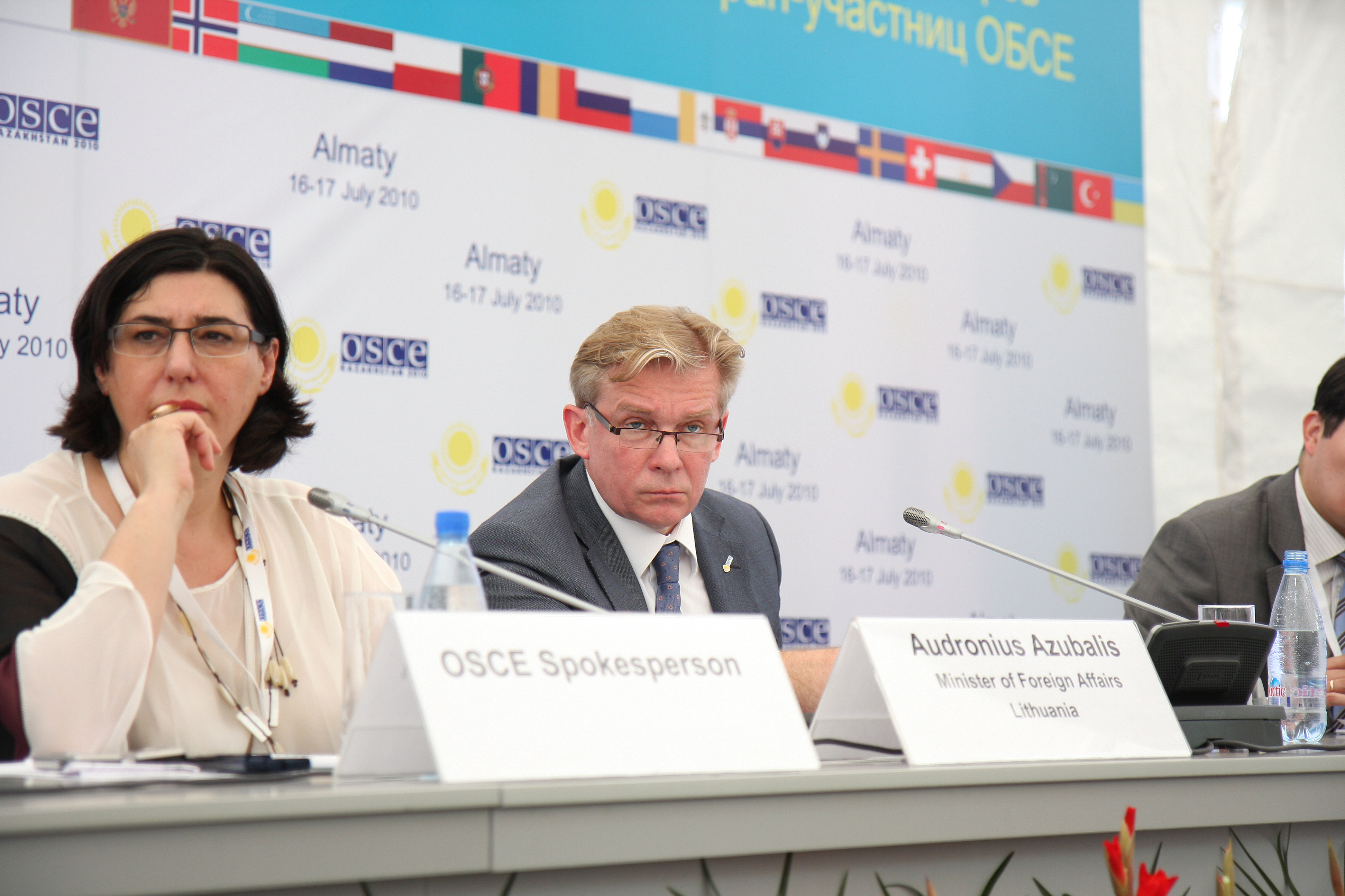 Audronius Azubalis, the Foreign Minister of Lithuania, which will hold the 2011 OSCE Chairmanship, at a news conference at the OSCE Informal Ministerial Meeting. Almaty, 17 July 2010.