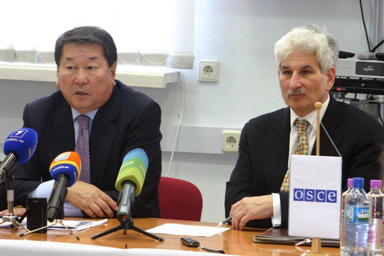 The Special Representative of the OSCE Chairperson-in-Office for Protracted Conflicts, Ambassador Bolat Nurgaliyev (l), with the Head of the OSCE Mission to Moldova Ambassador Philip Remler at a press conference in Chisinau, 23 September 2010.
