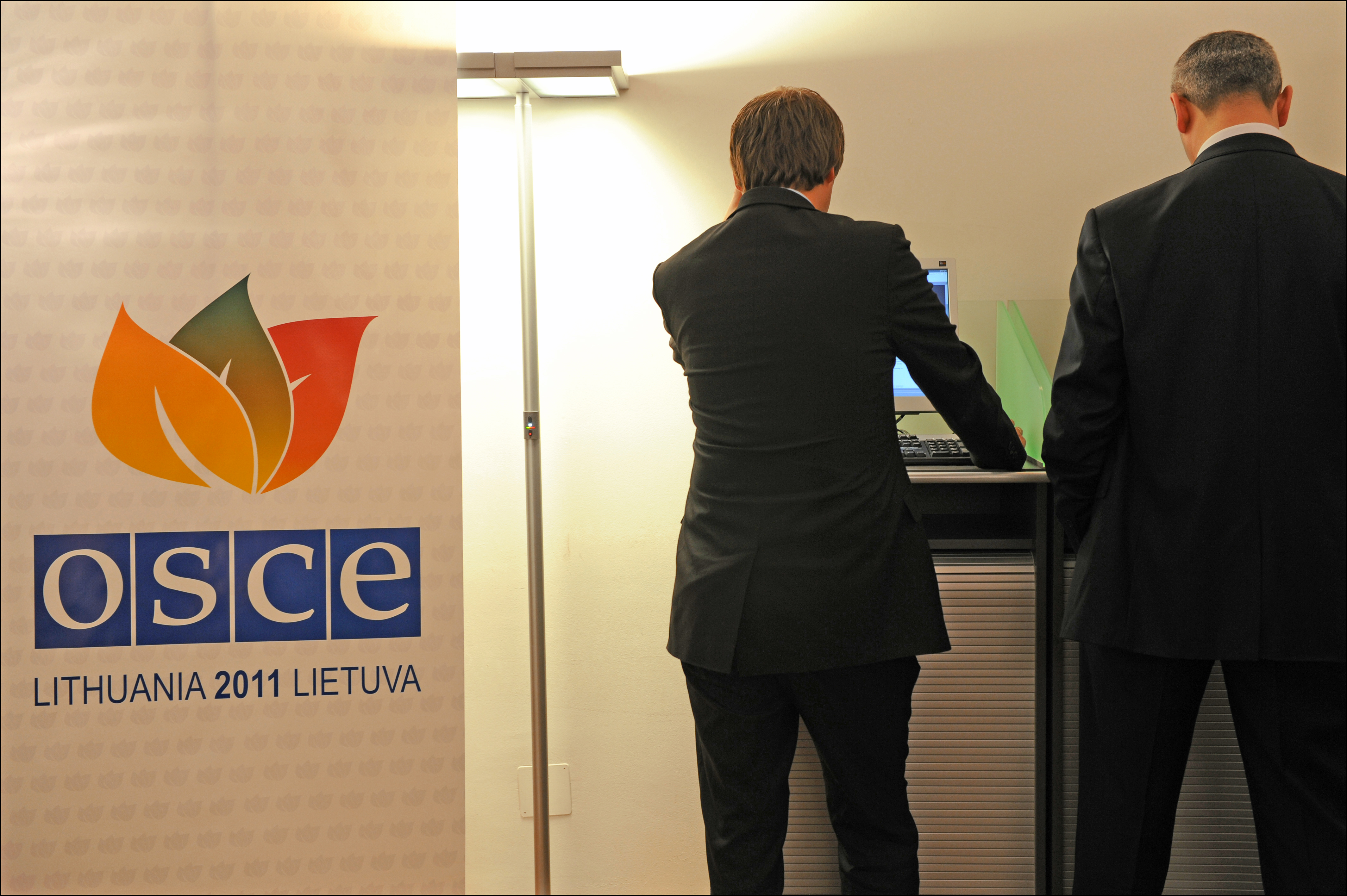 Members of OSCE delegations work next to Lithuania's OSCE Chairmanship logo, Vienna, 13 January 2011.